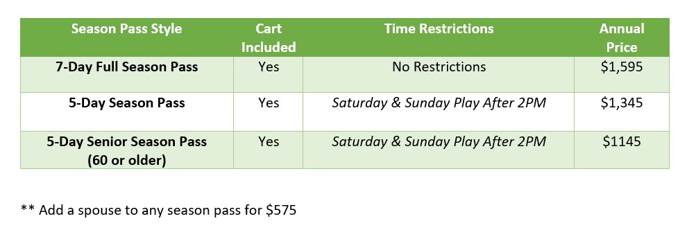 Whispering Pines golf course offers several options for seasonal golf passes. Season passes can be customized to fit your needs. View our most popular options below. Please contact the pro shop for more details. 2026 Season Pass Packages DOWNLOAD SEASON PASS APPLICATION